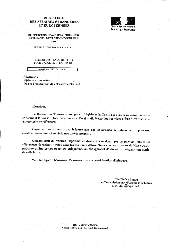 -signature sur le document de demande de transcription à faire légaliser en mairie