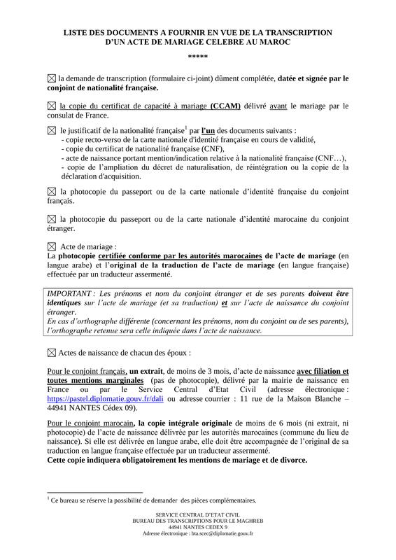 -acte de naissance partie marocaine : mention marginale du mariage et d'un éventuel précédent divorce