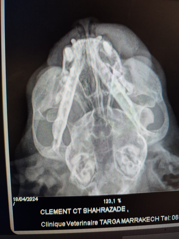 On m'annonce que la tumeur de Schéhérazade est cancéreuse, que l'os et visiblement légèrement touché, sur cette radio. La radio est montrée à un professeur de l'école vétérinaire de Rabat, pour qui cette tumeur est opérable. L'os pourrait être gratté. Nous avons l'obligation de séjourner dans une ville dans laquelle les soins vétérinaires pour les chats sont très peu développés. Il ne serait donc pas possible d'y assurer des soins post opératoires. Nous devons attendre pour effectuer la chirurgie avec des soins nécessaires ensuite. D-s mon retour en France, que j'espère le plus tôt possible, l'opportunité de radiothérapie ou de chimiothérapie doit être recherchée.
